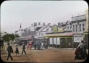 In September 1914 the city of Bendigo held a railway picnic which attracted numerous visitors, many arriving on special trains from Melbourne. At about 6 p.m. at the corner of Hargreaves and Mitchell streets a number of young men "who had been imbibing too freely" started an argument "regarding the war". The argument led to punches being thrown. One of the men was knocked down, "his head striking the roadway with considerable force". Others joined in and a considerable crowd quickly gathered to witness the melee. Mounted Constable Dwyer arrived on the scene and caught one of the belligerents, Norman Bruhn, by the scruff of the neck and took him into custody. Bruhn was locked up and charged with offensive behaviour.[14][15]