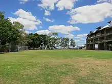 In the 1920s there was concern about a lack of level parade ground space behind the urban brick school building.[56] In 1929, 32 perches (810 m2) of additional land was acquired at the northwest corner of the school reserve, allowing the toilets to be relocated there.[57][58] A basketball court had been built at the corner of Hipwood and School streets by June 1923. By 1925 there was an average of nearly 600 children attending the school, as the extension of tram lines through Norman Park had "caused a large number of people to build in the vicinity of the school".[59][60][61][1]