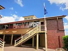 Two new brick blocks (Blocks B and E in 2017), sympathetic in design to the 1900 urban brick school building, were also added to the school and opened on 28 July 1934.[78] Block B was connected to the southeast end of Block A and featured decorative details to match Block C. It contained two classrooms on the first floor and one double classroom on the ground floor. The first floor had verandahs on the northwest and southeast sides, and a stairwell at the northeast corner led down to a ground floor verandah on the southeast side. Block E, which was highset with understorey play space, was connected to the northwest corner of Block A. It had three classrooms separated by folding partitions, and a southeast-facing verandah with a semi-enclosed hat room at the north end. Both blocks had hipped roofs of corrugated iron; Block B had a roof fleche and Block E had a dormer window over its central classroom.[79][80][81][1]