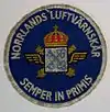 The unit standard was presented to the then Royal Luleå Anti-Aircraft Corps (Lv 7) in Luleå by the commander of the VI Military District, Major General Nils Roslund in 1943.[11] It was used as unit standard by Lv 7 until 1 July 2000. The standard is drawn by Brita Grep and embroidered by hand in insertion technique by the Kedja studio, Heraldica. Blazon: "On blue cloth in the centre the lesser coat of arms of Sweden, three open yellow crowns placed two and one. In the first corner the town badge of Luleå; two white keys, the left inverted (the original name of the battalion was Luleå Anti-Aircraft Corps). In the other corners two winged yellow gunbarrels of older pattern in saltire. Yellow fringe."[11]