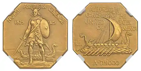 On January 30, 1925, Kvale attended a meeting of the Coinage Committee, at which the proposal that would become the Vermont Sesquicentennial half dollar was considered. Treasury officials were present in opposition, suggesting a medal be issued instead, and Kvale asked several questions about the Mint's issuance of medals.[12] On February 3, Kvale and his son Paul met with Treasury officials, bringing a draft bill authorizing the Bureau of the Mint to strike commemorative medals for the Restauration anniversary. Acting Mint Director Mary M. O'Reilly and Treasury Undersecretary Garrard Winston were dubious about the idea of striking silver medals that would be between the quarter and half dollar in size. To offset this concern, Paul Kvale suggested making the medal octagonal or hexagonal. O'Reilly and Winston favored the idea, and after Congressman Kvale met with legal counsel to the Treasury and other officials, he was assured of the department's full support.[7] Kvale also successfully lobbied the Post Office Department for the issuance of commemorative stamps; he told Third Assistant Postmaster General Warren I. Glover that, in a broader sense, the medal recognized the North American explorations of the Vikings around the year 1000.[13] Kvale declared that in seeking the souvenir medal and stamps, he was contributing to the "growth of the Norwegian heritage by having it 'preserved in metal' as well as 'paper time capsules'."[11]