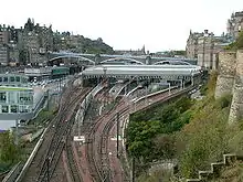 At the northern end of the bridge, where it meets Princes Street in the New Town, on the west side is the Balmoral Hotel, originally built as the North British Hotel, the North British Railway's hotel serving Waverley Station, which lies below. On the east side is Waverley Gate, originally the Edinburgh General Post Office, now serving as office space.