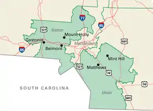 The 9th congressional district of North Carolina is a congressional district in south-central North Carolina. The district's current boundaries were redrawn in February 2016 after a U.S. District Court overturned the existing boundaries because of politically directed gerrymandering that suppressed minority representation.[4] The new congressional district consists of Union, Anson, Richmond, Scotland, and Robeson counties; a southeast portion of Mecklenburg County; and parts of Cumberland, Moore and Bladen counties.