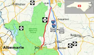 NC 134 is a predominantly two-lane rural highway that begins in downtown Troy at the intersection of North Main Street and East Main Street. Going north, it travels next to Denson Creek Golf Course before becoming the eastern edge of the Uwharrie National Forest. A couple of times the national forest goes over the eastern side of the road but not many. At Beane Country Road, the Uwharrie Forest finally goes west of the road as the road continues north. At Dawson Miller Road, NC 134 ends, just 600 feet (180 m) from the I-73/I-74/US 220 interchange.