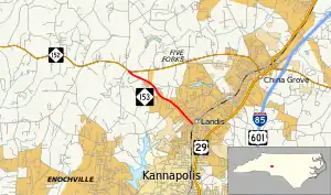 North Carolina Highway 153 (NC 153) is a 2.9-mile-long (4.7 km) primary state highway in the U.S. state of North Carolina. The highway serves as a spur of NC 152 into Landis.