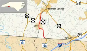A two-lane rural highway, it traverses 4.3 miles (6.9 km), starting at the South Carolina state line at Buffalo Creek, through the town of Earl, ending at NC 180, south of Patterson Springs.