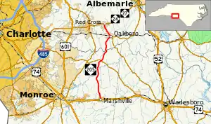 Established in 1935, it is the second incarnation NC 205, creating a new primary routing between the towns of Marshville and Red Cross. In the late 1940s, it was extended southwest along Main Street to the new alignment of US 74; it then changed by 1953 onto a new extension of Elm Street to US 74, leaving Main Street.[2]