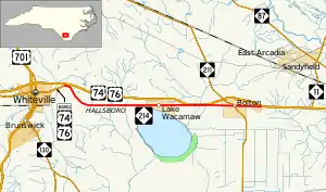 NC 214 begins at an intersection with Business U.S. Routes US 74 Business and US 76 Business about 1+1⁄2 miles (2.4 km) east of Whiteville. The intersection is located just south of exit 244 on US 74/US 76. The two-lane road heads southeast then due east through a rural area until reaching the communities of Hallsboro and Artesia. NC 214 heads north of Lake Waccamaw. Though the road never strays more than 1 mile (1.6 km) from the US 74/US 76 freeway throughout its entire length, the freeway dips south to cross the Friar Swamp/Green Swamp immediately adjacent to the lanes of NC 214. After heading through the town of Bolton where it intersects NC 211, the road briefly widens from a two-lane road to a four-lane divided highway but soon ends at an intersection with US 74/US 76 1 mile (1.6 km) east of the town.[1]