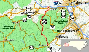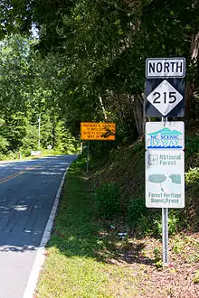 North Carolina Highway 215 (NC 215) is a highway in western North Carolina that runs from the town of Rosman in Transylvania County to Canton at Interstate 40 and U.S. Route 74 (US 74). The portion from Canton to Rosman is a part of the US Forest Service's Forest Heritage Scenic Byway. It travels high into the mountains along a scenic stretch of the upper West Fork of the Pigeon River, and intersects the Blue Ridge Parkway at Beech Gap at an elevation of approximately 5,300 feet (1,600 m).