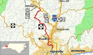 North Carolina Highway 251 (NC 251) is a north/south state highway in western North Carolina. Its southern terminus at an interchange with U.S. Route 19 (US 19), US 23, and US 70 (future Interstate 26 or I-26) on the border of Asheville and Woodfin. The road largely follows the east bank of the French Broad River until its northern terminus at US 25/US 70 near Marshall in Madison County.