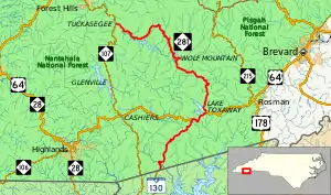 NC 281 is a 36.6-mile (58.9 km) two-lane mountain highway that begins at the South Carolina state line in Jackson County, before quickly entering Transylvania County. In South Carolina, the road continues south as SC 130. It runs concurrent with US 64 near Sapphire, then goes 2.5 miles (4.0 km) east where it splits and continues north to Lake Toxaway. Continuing northwest, the highway becomes aggressively curvy, steep, narrow and in a couple of locations is a gravel road. NC 281 crosses back into Jackson County at Owens Gap (3,590 ft (1,090 m), highest point on route), near Round Mountain to the northeast. The road widens again near the Tuckasegee River and passes by several lakes before ending in Tuckasegee.[2][3]