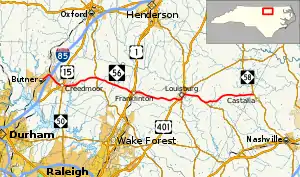 NC 56 is a predominantly two-lane rural highway connecting the three Counties of Granville, Franklin and Nash. Acting as a spur route, it begins at the intersection of Central Avenue/C Street, in Butner, and goes northeast to connect with I-85 (exit 191). Going southeasterly, it enters Creedmoor and has two brief concurrencies with US 15 and NC 50. Going in an easterly direction, it crosses NC 96, in Wilton, halfway before reaching Franklinton, where it connects with both US 1 and US 1A. Continuing east for 8.5 miles (13.7 km), it reaches Louisburg, where it has another short concurrency with US 401 and NC 39 along Bickett Boulevard. At the intersection of East Nash Street, NC 56 begin its concurrency with NC 581 to Mapleville. Continuing east for another 9.3 miles (15.0 km), it reaches its eastern terminus at NC 58, just over the Franklin/Nash County line and north of Castalia.[1]