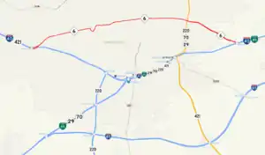 North Carolina Highway 6 (NC 6) was an 8-mile-long (13 km) North Carolina state highway. It ran entirely in Guilford County and served primarily to connect Interstate 40 (I-40) and Business I-85 (I-85 Bus.) commuters in Greensboro. It was decommissioned in 2005.