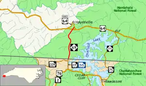 NC 69 runs from the Georgia border south of Hayesville and along the western shore of Chatuge Lake. The route crosses U.S. Route 64 (US 64) before entering downtown Hayesville, where it meets its northern terminus at a roundabout with US 64 Bus.