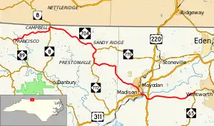 NC 704 is a mostly two-lane rural highway that traverses 38.7 miles (62.3 km). Beginning at NC 89, near Francisco, east through Madison, to NC 65 near Wentworth. This highway connects the communities of Campbell, Coleville, Sandy Ridge, Delta, Prestonville and Pleasantville.