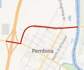 ND 59 starts at a diamond interchange with I-29 on the western edge of Pembina. It turns north and follows the western and northern edges of the small town, acting as a bypass to through traffic. The route the crosses a bridge over the Red River, crossing the Minnesota state line and continuing east as MN 171.