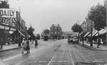 In 1905. the Metropolitan Electric Tramways (the M.E.T.) opened a tramline between Highgate and Whetstone and this was crossed by another from New Southgate to Golders Green from 1909. To facilitate this a tramway depot was opened in Woodberry Grove. Trams combined with motorbus services promoted the development of the retail district we see today. During the 1930s the old Ballards Lane, which terminated where the Embassy Lounge (formerly called the Purple Rain Bar, before that the Cherry Tree and previously the Coach Stop) is today, was replaced by a new road called Kingsway. In 1937 the new plot created by this diversion became the location for the Gaumont Cinema. This was demolished in 1987 to be replaced with the recently opened Arts Depot.