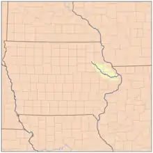 The Maquoketa River is a tributary of the Mississippi River, approximately 150 miles (240 km) long,[2] in northeastern Iowa in the United States. Its watershed covers 1,694 square miles (4,387 km2)[3] within a rural region of rolling hills and farmland southwest of Dubuque. It is not to be confused with the Little Maquoketa River, another distinct direct tributary of the Upper Mississippi River meeting the Big River north of Dubuque. The river and its tributaries mark the border of the Driftless Area of Iowa, with the areas east of it not having been covered by ice during the last ice age. Its name derives from Maquaw-Autaw, which means "Bear River" in Meskwaki.[4]