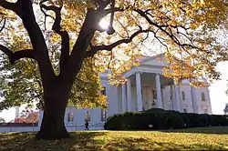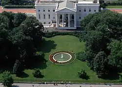 A semicircular driveway runs from the northwest gate through the North Portico, sweeping back to Pennsylvania Avenue through the northeast gate.[1] A circular pool with fountain is centered on the north portico of the White House.