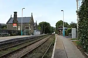 The platforms heights here are low and wooden boarding steps were provided on both platforms for many years – easy access ramps have now been fitted to improve accessibility on each side. Shelters are provided on both platforms, along with digital CIS displays a pay phone and timetable posters to offer train running information. The platforms are linked via a barrow crossing, so mobility-impaired and wheelchair users are advised not to use this without assistance.[5]