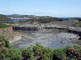 While transport and especially the railways and ferries have been North Queensferry's most obvious industries, one local industry that pre-dated the arrival of the railway is quarrying. In the north east of the peninsula on which North Queensferry stands there is a vast quarry, Cruicks Quarry, owned by Tarmac.[14] The stone is whinstone, or quartz dolerite, an extremely hard igneous rock found here as a geological sill. Dates vary, but the quarry has been worked at least since the 1820s. The quarry has been non-operational since 2009, although Planning Permission was granted by Fife CC in 2012 for further working.[15] The stone from the sill was crushed down to various sizes, the most valuable being the 10 to 14 mm size used for road surfacing.[16] In earlier times stone from the quarry was used to build the docks at Leith and Liverpool as well as many of the pavements of London. Ferryhills Road, which leads out of the village towards Inverkeithing, skirts the edge of this huge quarry. A viewing platform on the west is now overgrown, but the quarry can be seen by turning right at Jamestown into Cruickness Road, then following the road round to the old weighbridge. The pool occupied by Deep Sea World is also an old whinstone quarry.