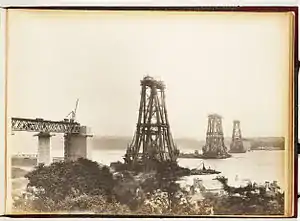 The Town Pier, the main ferry terminus for many years, was designed by John Rennie and built between 1810 and 1813. The Harbour Light Tower was erected on its current site in 1817; until then, the Signal House was used by boats as an aid to navigation. Ferries berthed both at the Town Pier and at the Battery Pier (now beneath the Forth Bridge). To accommodate the deeper draughts of the new, larger steam-powered ferries, Thomas Telford extended Town Pier in 1828 to its present length. The Railway Pier, on the far side of West Bay, was the terminus of the new Dunfermline-North Queensferry Railway which opened in 1877.[5] The Railway Pier was used as one of the northern ferry terminals from 1877 to 1890, and in 1920 it replaced the old Town Pier.