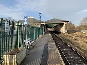 The station is unstaffed and has no ticketing provision, so all tickets must be bought on the train or prior to travel. A Harrington Hump has been installed to improve accessibility to the trains for mobility-impaired passengers and the waiting shelter here was replaced in 2015 as part of the Tees Valley line improvement programme - this also saw the installation of a digital CIS display, new signage and CCTV.[5] Train running information is also available via a public telephone and timetable posters. The station is not listed as suitable for wheelchair users on the National Rail website due to the approach path being steeply graded.[6]