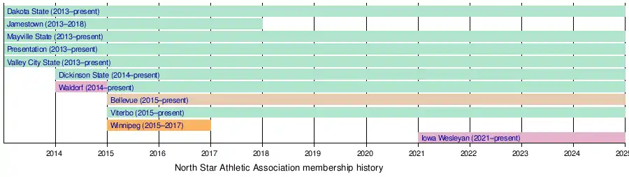 - 2013 - The North Star Athletic Association (NSAA) was founded. Charter members included Dakota State University, the University of Jamestown, Mayville State University, Presentation College and Valley City State University, effective beginning the 2013-14 academic year.