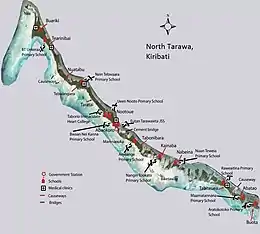 Buota was joined by a bridge to South Tarawa in 1995 and has since increased in population and is becoming more like part of urban South Tarawa. Abatao is not accessible by road, but the channel can be easily walked at low tide and there is a boat service at high tide. For people in Abatao and Buota, it is much easier to access schools, clinics and other services on South Tarawa than to travel to the Government Station in Abaokoro.[4] Apart from the bridge from Buota to Tanaea, small causeways connect the villages of Tebwangoroi and Taratai, Tebwangoroi and Nuatabu.[4] The erosion and accretion that are occurring along the shoreline is identified as being linked to aggregate mining, land reclamation and the construction of causeways that has been thought to change the currents along the shoreline.[5]