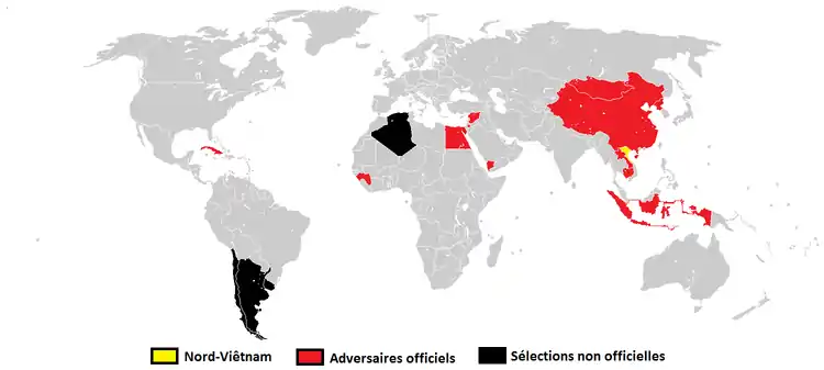 The Democratic Republic of Vietnam national football team (Vietnamese: Đội tuyển bóng đá quốc gia Việt Nam Dân chủ Cộng hòa) was the national team of the Democratic Republic of Vietnam (commonly known as North Vietnam) from 1954 to 1976. It existed side by side with a separate South Vietnam team, which represented the French-controlled southern portion of Vietnam. Unlike South Vietnam (which was a member of both FIFA and the Asian Football Confederation), North Vietnam's lack of diplomatic recognition on the part of many other states prevented it from ever joining either FIFA or the AFC. Due to its lack of membership in major football bodies, North Vietnam never participated in qualification for the FIFA World Cup or the AFC Asian Cup (unlike its southern counterpart, which participated in both). Because of North Vietnam's international isolation, its national team mostly played against other Communist and Communist-sympathizing countries during its relatively brief existence.[1]
