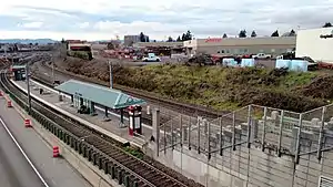 ![]() The station viewed from the viaduct carrying 60th Avenue over the station and the Banfield Freeway | |