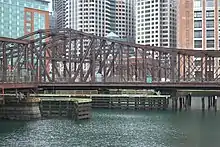 The Northern Avenue Bridge, also known as the Old Northern Avenue Bridge, is a bridge that spans Fort Point Channel Boston, Massachusetts. Built in 1908, it was closed to vehicle traffic in 1997 and operated as a pedestrian bridge until December 2014 when it was closed after inspectors found that thirteen floor beams were unsafe for pedestrians.[1] In an October 26, 2015 letter, the Coast Guard informed the City of Boston that the bridge was a 'hazard to navigation' due to the risk of it falling into the Fort Point Channel and requested removal of its most vulnerable portion.[2] The center span of the truss also carried a single track for the Union Freight Railroad, although it was designed for two tracks.[3] From 1912 to 1948, the bridge abutted a floating firehouse for Engine 44 of the Boston Fire Department.[4] Following its closure as a road bridge, various redevelopment schemes have been proposed for the bridge, as well as outright demolition of the span.[5]