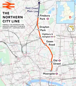 The Northern City Line is a commuter railway line in England, which runs from Moorgate station to Finsbury Park in London with services running beyond. It is part of the Great Northern Route services, and operates as the south-eastern branch of the East Coast Main Line (ECML). It is underground from Moorgate to Drayton Park in Highbury, from which point it runs in a cutting until joining the ECML south of Finsbury Park. Its stations span northern inner districts of Greater London southwards to the City of London, the UK's main financial centre. Since December 2015, its service timetable has been extended to run into the late evenings and at weekends,[2] meeting a new franchise commitment for a minimum of six trains per hour until 23:59 on weekdays and four trains per hour at weekends.[3]