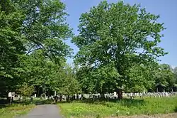 The Northfield Center Cemetery is located a short way west of the town center, at the western end of Parker Avenue. It is bounded on the east by a railroad right of way, and on the west by a wooded embankment leading down to the flood plain of the Connecticut River. It is 7.64-acre (3.09 ha) in size, and consists of roughly level ground, fringed with trees on the three sides not abutting the railroad tracks. The main entrance is at the southeast corner, and a narrow paved road provides a roughly oval circulation pattern through the grounds.[2]