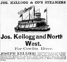 - "Jos. Kellogg & Co's Steamers Joseph Kellogg and Northwest for Cowlitz River". The Oregon Mist (advertisement). Vol. 8, no. 37. St. Helens, OR: J.R. Beegle. September 11, 1891. p.4, col.6.