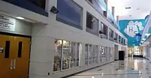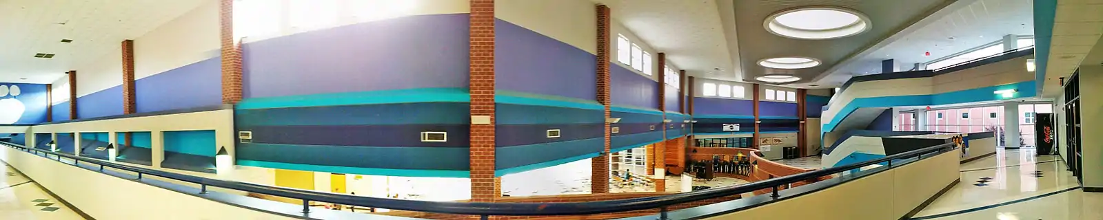 The sub-schools are connected by a large, unique main hallway called the skywalk, which features a tiered three-story design. A person overlooking the third floor skywalk can see straight down to the first floor main hallway. The building features an artistic, colorful design theme using multiple variations of the colors blue, purple, teal, gray, and white. These were inspired largely by the official school colors, navy blue and white.