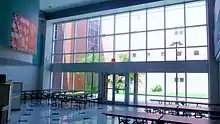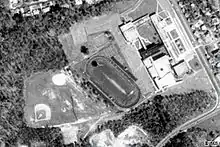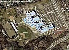 The school has six tennis courts located just outside the auditorium to the east of the building and it has several basketball courts located at the rear of the building outside the food court, which have been decommissioned and now serves as an area which houses several of the school's portable classrooms. There are three athletic fields[5] in the rear of the building: the football/soccer stadium, which also encompasses the running track which surrounds the football/soccer field; a softball field, and a baseball field.