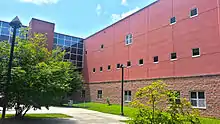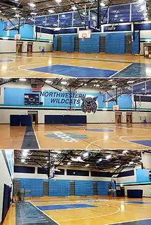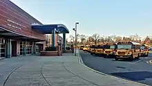 Northwestern's campus features three courtyards[5] between the four wings of the building. The school has a total of five parking lots: the large main parking lot (located in front of the facility, where the former facility once stood) designated for staff and visitors; an adjacent lot located in front of the auditorium, reserved for staff and students; two smaller lots at the rear of the facility, reserved for staff or visitors attending athletic events; and a large bus bay capable of accommodating 44 school buses, located in front of the facility, which doubles as another lot for staff and visitors, during and after the regular school day.