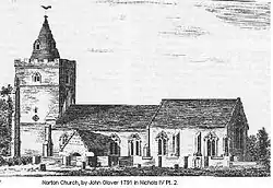 The church seen today was built in the early 14th century, although it was heavily restored around 1841.[8] The tower formerly had a small spire, but this was dismantled in 1890 as it had become unsafe.[7] The tower had also originally contained 3 bells: 1640 and the other two in 1663. One, however, was recast in 1849.[7] The tower's clock was made by Samuel Deacon's company in Barton in the Beans. It was installed on 1 September 1840, having cost £80.[7] The church vesty was built in 1850 and cost £100 to construct.[7]