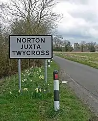 The village has traditionally, and historically, been known as "Norton": deriving from the Anglo-Saxon, meaning "North-Town"; with variable spellings including "Northton" and "Nortone".[2] The village, however, was also known for a brief period in the 17th century as "Hoggs Norton".[2] The village's current name was acquired to differentiate the village from the several others in the county named Norton. "Juxta" is Latin for "near",[3] and Twycross is a small village approximately 2 miles southeast of Norton.