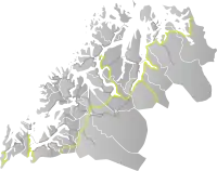 County Road 86 (Norwegian: Fylkesvei 86) is a 110-kilometre-long (68 mi) highway in Troms og Finnmark county, Norway. The eastern end of the road begins in the village of Andselv (in the Bardufoss area of Målselv Municipality). It then heads west to the Gisund Bridge connecting the mainland of Norway to the large island of Senja. The road then heads across the island of Senja to the village of Torsken on the western coast of Senja Municipality. Part of the route is one of eighteen designated National Tourist Routes in Norway.[1][2]