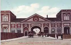 The old Norwich City station stood where today's roundabout is situated on the Inner link road A147 which links Barn Road with St Crispins Road close to Anglia Square.[4][5] The present Norwich railway station is about 1 mile away, to the southeast.