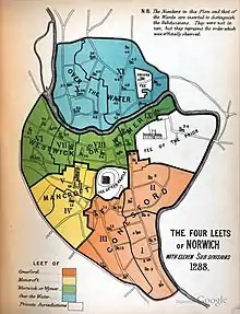 Over the Water was one of four 'Great Wards' that existed inside the city boundary from 1404 to 1835, the other wards being Conisford, Mancroft, and Wymer. The wards replaced the court leets that had existed since the 13th century.[9]