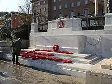 As part of civic redevelopment of the market area and surrounding buildings in 1938, the cenotaph was moved to a site on Market Place, between the new City Hall and the castle. There it formed the centrepiece of a dedicated memorial garden by C.H. James and S.R. Pierce. The garden was opened by King George VI on 29 October 1938. The whole monument now stands on a terrace which runs parallel to the city hall, sloping towards Market Place with steps accommodating the gradient. A row of eight ornamental lamp-posts stands along either side of the memorial itself, one of which is a later replacement. Two flagpoles stand at the corners, at the bases of which are low relief brass carvings of allegorical figures of Peace and Plenty.[3][5][17]