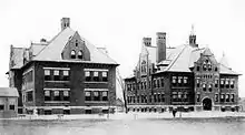 Norwood's first high school was an 8-room building constructed alongside a nearly identical new 12-room elementary school building on Allison Street between Courtland and Weyer Avenues.[23] Both schools opened in 1897 and are believed to have been designed by prominent Cincinnati architect, Samuel Hannaford,[26] who also designed the similar Venetian Gothic-styled Cincinnati Music Hall. Norwood's population had grown to an estimated at 7,000 residents the year prior to the school opening, and this was the first time Norwood offered a full four-year high school curriculum. The north high school building was destroyed by fire in 1917, but the south elementary building still stands today at the corner of Allison Street and Weyer Avenue.