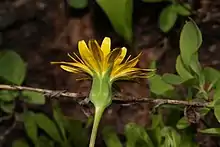 Nothocalais alpestris is a nearly hairless perennial herb growing from a thick caudex and reaching about 25 cm (10 in) tall. The leaves are located around the base of the stem and have toothed, wavy, or smooth edges, and sometimes a thin coat of small hairs. They measure up to 20 cm (8 in) long. The flower head is borne singly, usually on a leafless stalk. Hairless phyllaries are green, usually with tiny purple dots and nearly equal in length. The outer ones are wider than the inner. The corolla contains many yellow ray florets and no disc florets. The fruit from each floret is a cylindrical achene up to 1 cm (1⁄2 in) long, not considering the large pappus of up to 50 hairlike white bristles which may be an additional centimeter in length.[3][4]