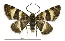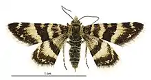 The female moth lays her eggs within the flower buds of their host plant.[11] When the larvae emerge from their eggs, they eat into the leaves or buds of their host, hiding from predators.[11] Once they are large enough, they emerge to feed from the fresh growth of the plant.[11] N. ortholeuca pupate in a loose cocoon on the ground under their host.[11] N. ortholeuca are day-flying moths.[9] They are low but fast flyers and constantly vibrate their wings to enable them to take off rapidly.[11] Adults are on the wing in January, February and March.[3][10]