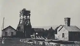 On 1 September 1880, a 10-meter chunk of the mine wall detached, crumbled, and crushed the receiving level, trapping two miners below. These miners were trapped in the mine for a week, but emerged alive.[18] From 1880 to 1881, the facilities of the Notre-Dame Mine were completely reworked. The pit was restored and a locker room and a wooden building between the machine room and the receiving room were constructed.[19] In 1892, a significant bed was discovered behind a rising stratum of rock, but two years later, a number of flaws appeared. The mine of Notre-Dame would soon be closed, its resources being effectively depleted.[20] In 1896, the mine was abandoned but not yet plugged.[20]