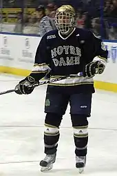 The Notre Dame Fighting Irish men's ice hockey team is the college ice hockey team of the University of Notre Dame, competing at the NCAA Division I level as an associate member of the Big Ten Conference. The Irish play their home games at Compton Family Ice Arena. The head coach of the Fighting Irish is Jeff Jackson, and his assistant coaches are Paul Pooley, Andy Slaggert, and Max Mobley.