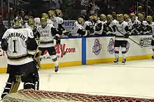 The following season, Notre Dame finished with a record of 13–17–8 and ended the season after being swept by Ohio State two games to none in the three game opening round series of the CCHA Playoffs.[7][8] The Irish rebounded in the 2010–11 regular season at 23–13–5, and clinched their second trip to the Frozen Four in program history by defeating New Hampshire 2–1 in the Northeast Regional Final. The Fighting Irish faced the East Regional Champion Minnesota-Duluth in the National Semi-finals. The Irish fell to the eventual national champion 3–4.[9]